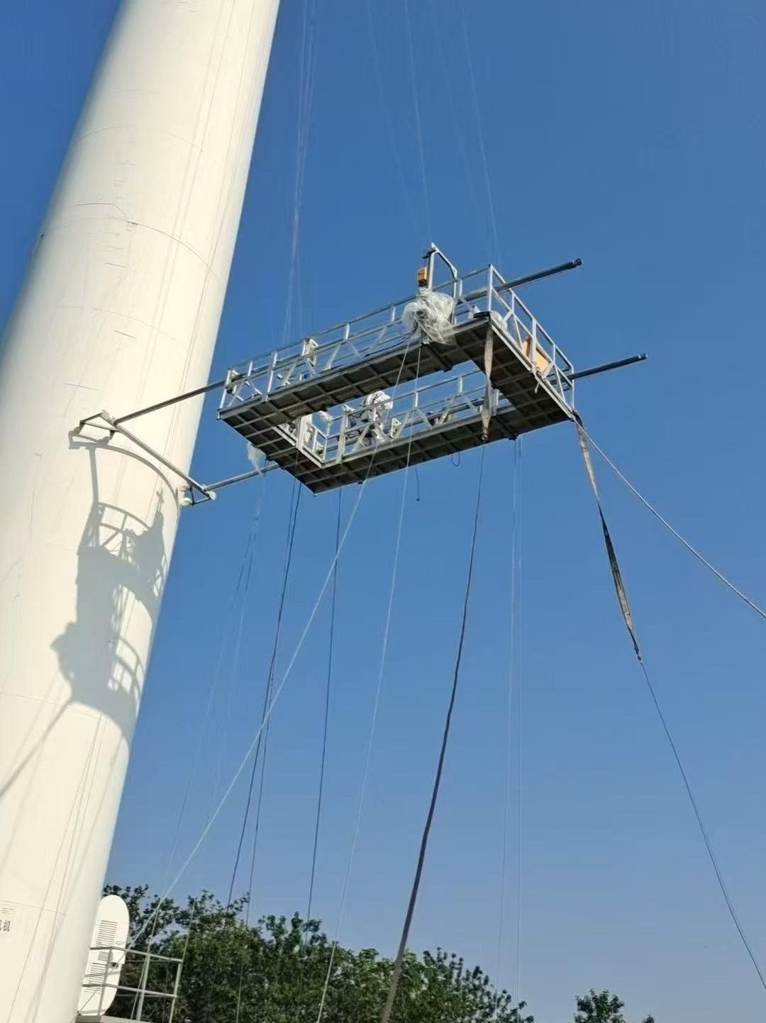 A suspended platform suitable for wind turbine blade maintenance, tower repair, and other similar applications, providing a safe and windproof green energy maintenance solution.